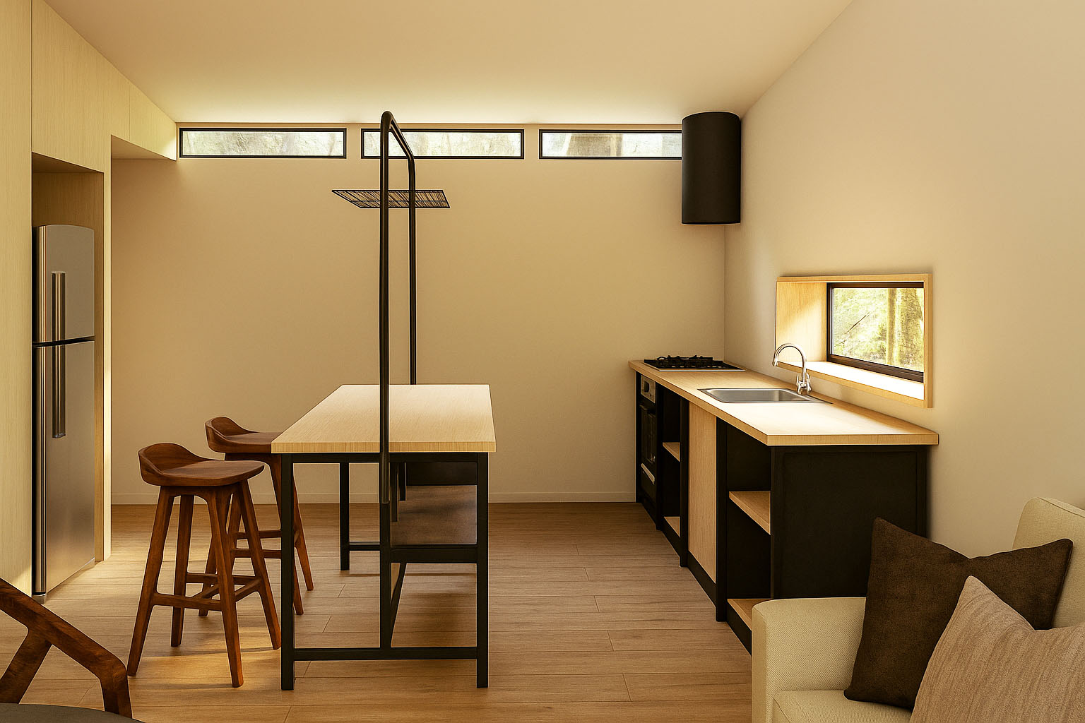 El diseño necesitaba la protección respecto del ruido exterior, buscando enmarcar las mejores vistas con ventanales sobrios y estratégicos. Además los mobiliarios, tales como los de cocina, fueron diseñados de forma específica para la funcionalidad y confort de quienes habiten las instalaciones.